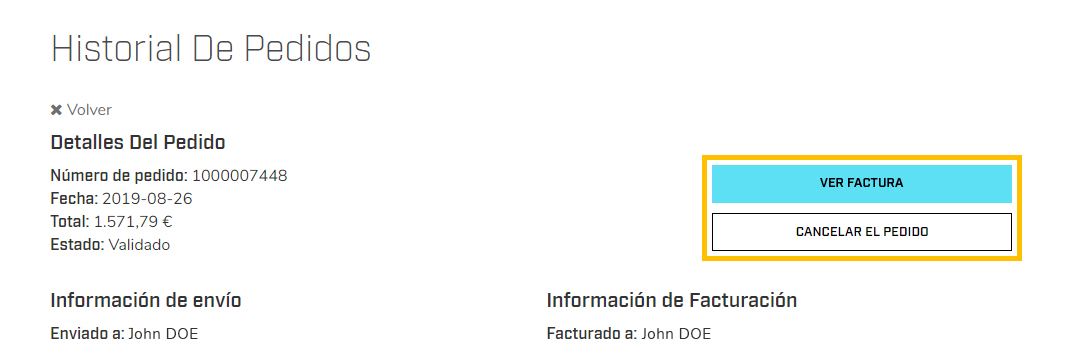 Al pulsar el botón Ver en cada pedido, se mostrarán los detalles del pedido. También puede consultar la factura o cancelar el pedido.- Si tiene cualquier otra pregunta sobre el estado de su pedido, póngase en contacto con nuestro equipo de atención al cliente: